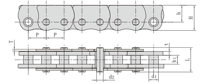 鏈號 節(jié)距 套筒直徑 內(nèi)節(jié)內(nèi)寬 銷軸直徑 銷軸長度 鏈板尺寸 抗拉強度