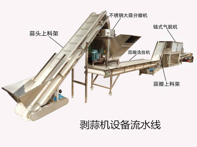 用機(jī)器代替手工剝蒜皮的機(jī)械,整個剝蒜機(jī)設(shè)備流水線分為:蒜頭上料架,不銹鋼大蒜分瓣機(jī),蒜瓣選撿機(jī),蒜瓣上料架以及