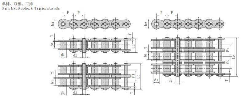 鏈號 節(jié)距 滾子直徑 內(nèi)節(jié)內(nèi)寬 銷軸直徑 銷軸長度 內(nèi)鏈板高度 鏈板厚度 排距 抗拉強(qiáng)度 平均抗拉強(qiáng)度 每米長重