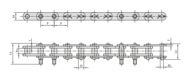 鏈號 節(jié)距 套筒直徑 內(nèi)節(jié)內(nèi)寬 銷軸直徑 銷軸長度 鏈板高度 鏈板厚度 抗拉強(qiáng)度 平均抗拉強(qiáng)度 每米長重