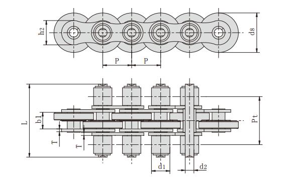 鏈號 節(jié)距 滾子直徑 內(nèi)節(jié)內(nèi)寬 銷軸直徑 銷軸長度 鏈板尺寸 排距 抗拉強度 平均抗拉強度